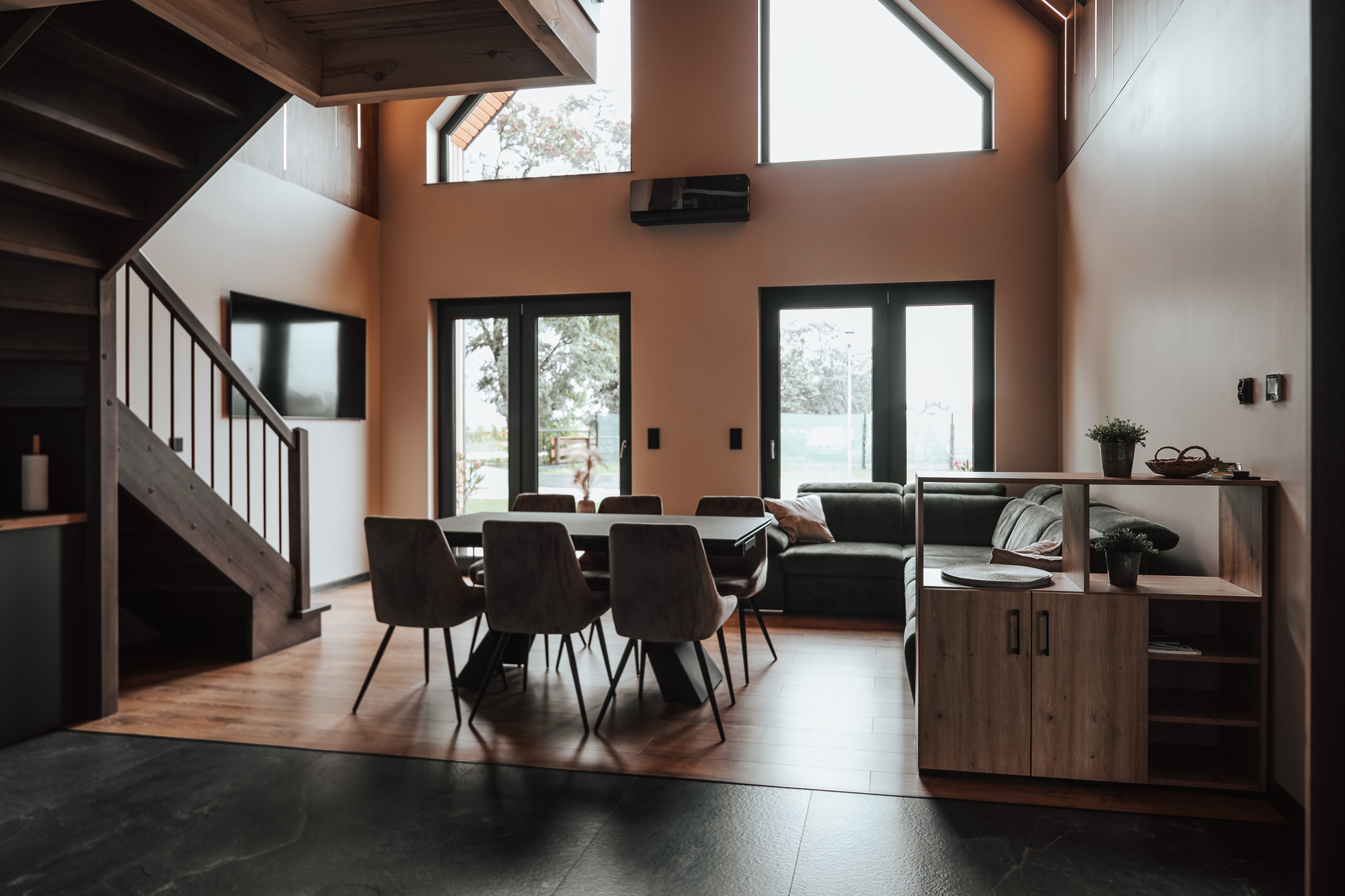 Dom posiada własne Wi-Fi, dostęp do telewizji satelitarnej, Netflixa oraz dużą antresolę nad salonem z nowoczesnym oświetleniem LED