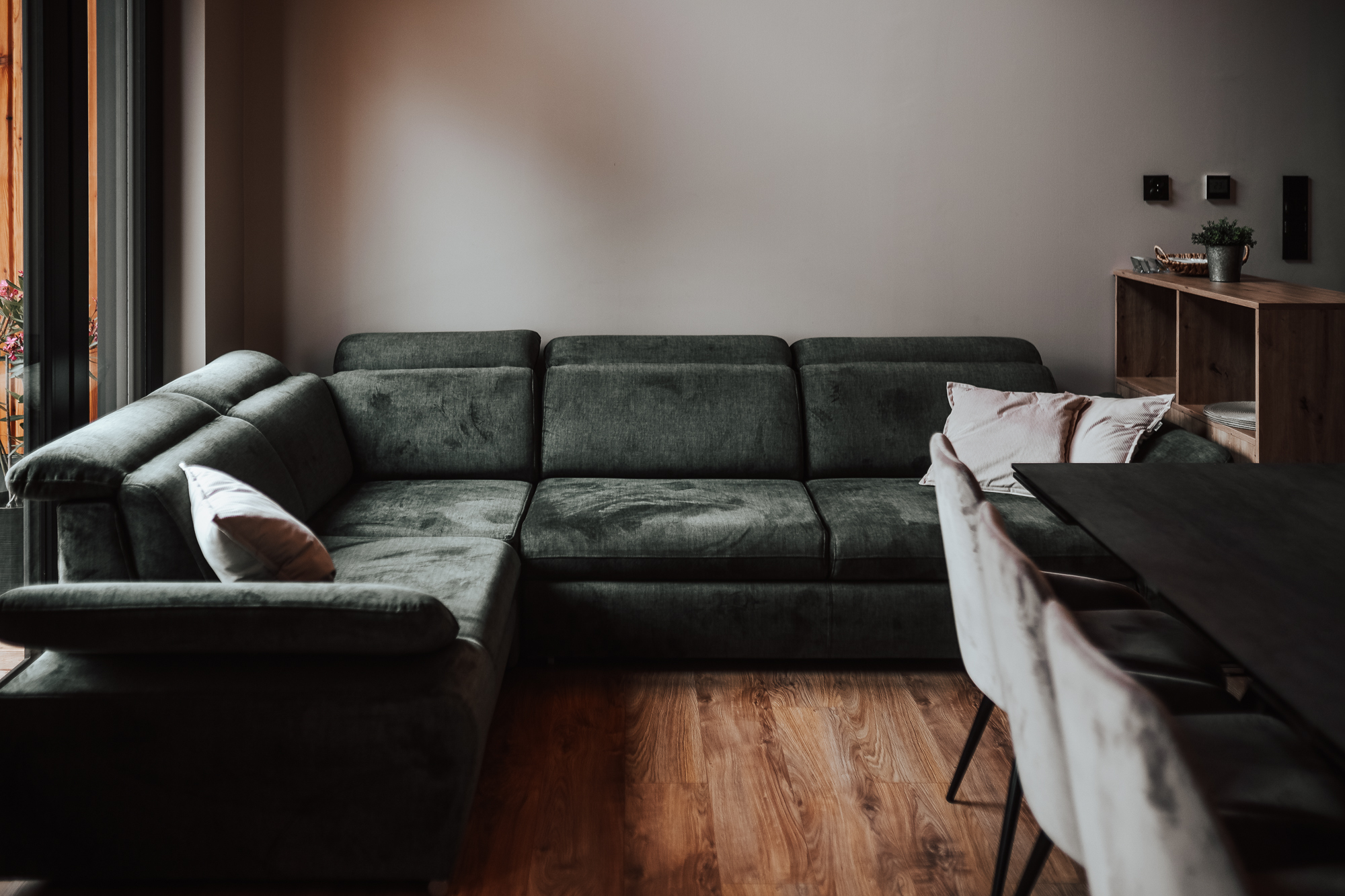 Dom wykończony w ciepłych i stonowanych kolorach, które zapewniają spokój i harmonię. 3 wygodne sypialnie, 2 łazienki oraz salon z aneksem kuchennym i narożnikiem z funkcją spania umożliwia pobyt nawet dla 8 osób.